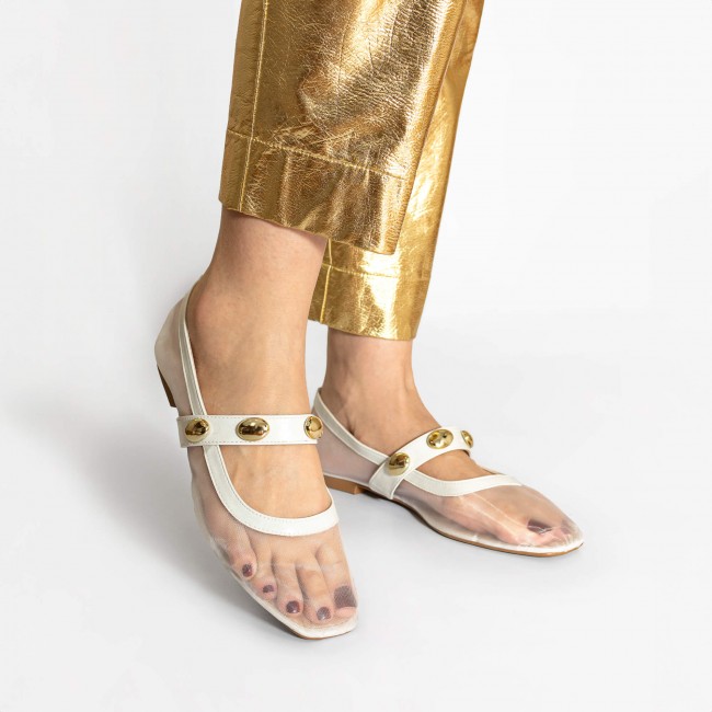 Uma coisa é certa: com essa sapatilha você não passa despercebida. Com bico quadrado moderno, tela transparente super leve e detalhes cromados que fazem o look brilhar, ela é a definição de estilo com conforto. A tira no peito do pé tem enfeites impactantes e elástico na lateral, que facilita o calce e acompanha seus movimentos sem apertar. A sola em borracha garante segurança e flexibilidade pro dia todo. Ela combina com tudo – de peças básicas a produções fashionistas. Ideal pra quem quer fugir do óbvio e apostar em um modelo diferente, mas fácil de usar. Uma sapatilha que entrega tudo: tendência, conforto e presença.